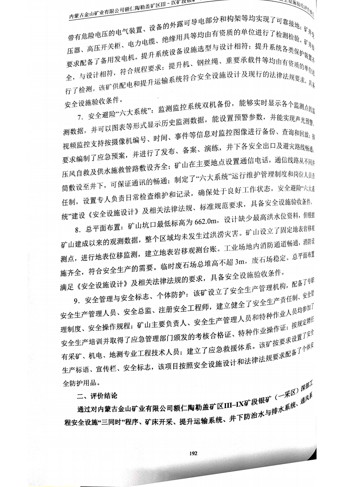 我公司接受委托后,組建了驗(yàn)收評(píng)價(jià)項(xiàng)目組,多次到現(xiàn)場(chǎng)勘察、收集資料;對(duì)其開采方法、生產(chǎn)工藝及生產(chǎn)系統(tǒng)、安全設(shè)施、設(shè)備、裝置和安全管理等系統(tǒng)進(jìn)行了全面檢查;對(duì)該建設(shè)項(xiàng)目的合法性、安全設(shè)施“三同時(shí)”程序的符合性、礦山生產(chǎn)系統(tǒng)與輔助系統(tǒng)安全設(shè)施的符合性等進(jìn)行了系統(tǒng)評(píng)價(jià),并提出了安全對(duì)策措施和建議。針對(duì)評(píng)價(jià)過程中提出的現(xiàn)場(chǎng)問題經(jīng)礦方整改后,我公司進(jìn)行了現(xiàn)場(chǎng)核查,在此基礎(chǔ)上嚴(yán)格按照相關(guān)法律法規(guī)、標(biāo)準(zhǔn)規(guī)范要求,編制了《內(nèi)蒙古金山礦業(yè)有限公司Ⅲ–Ⅸ礦段銀礦(一采區(qū))深部工程安全設(shè)施驗(yàn)收評(píng)價(jià)報(bào)告》。