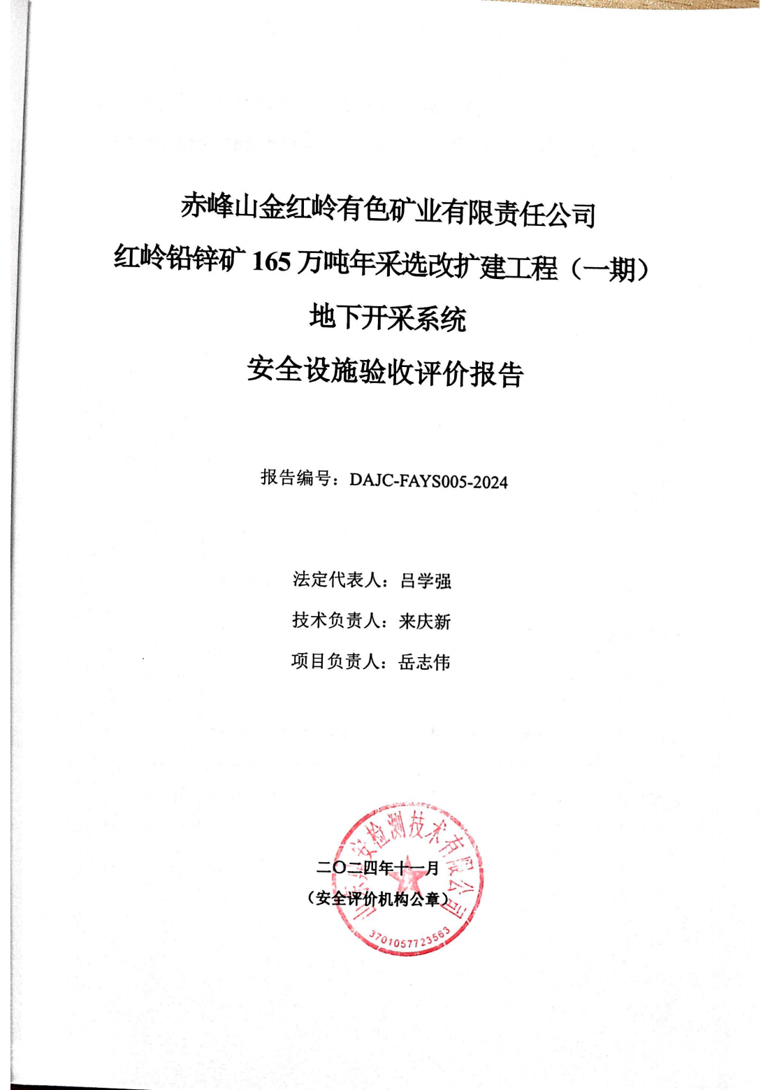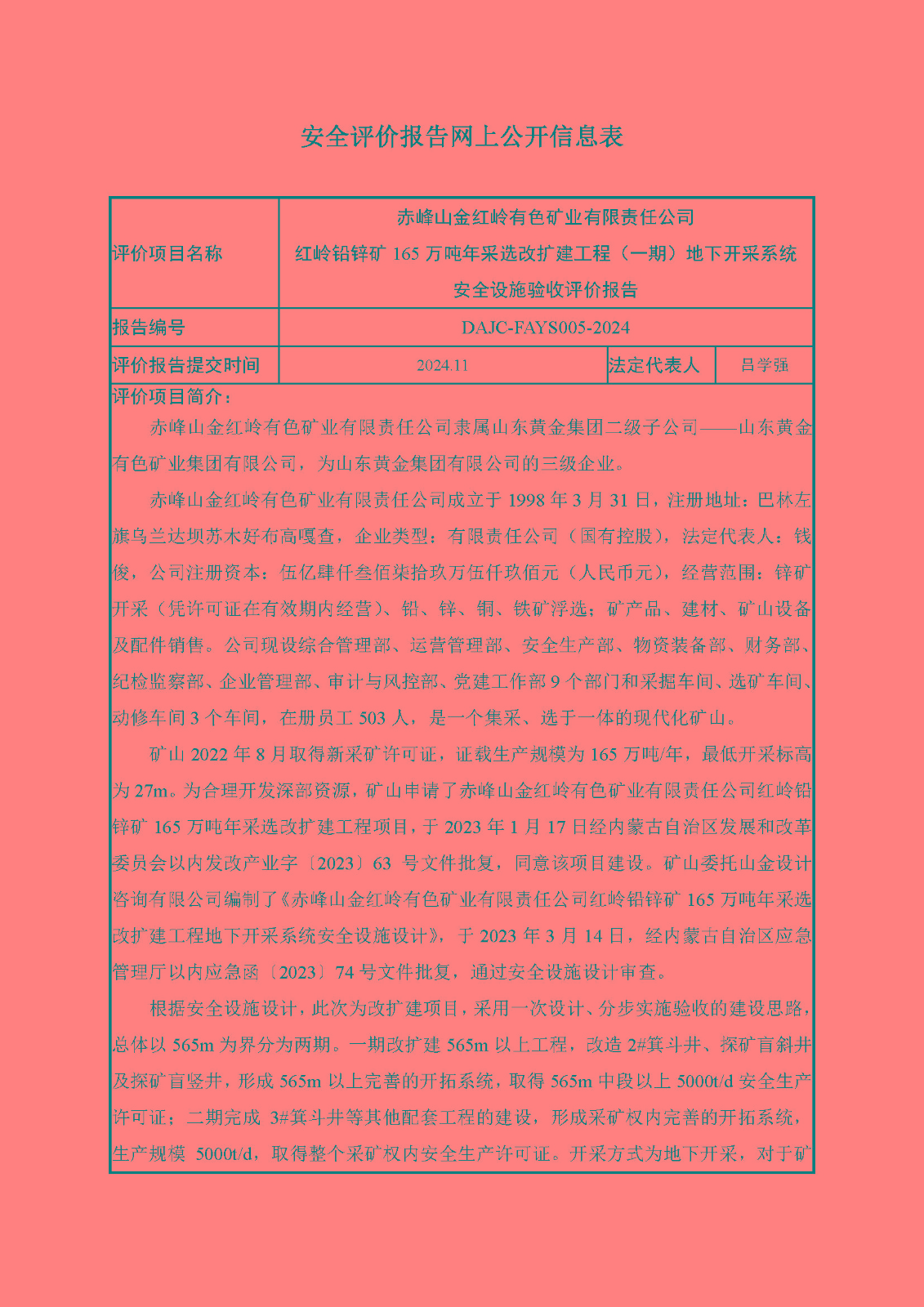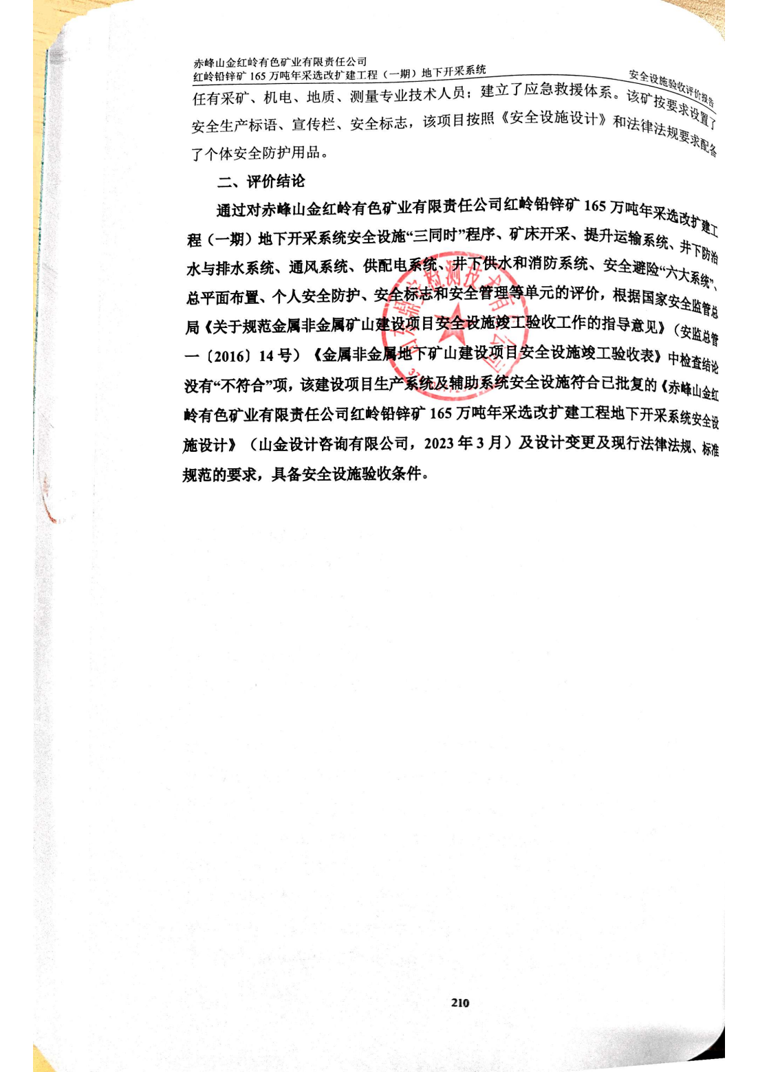 赤峰山金紅嶺有色礦業(yè)有限責(zé)任公司 紅嶺鉛鋅礦165萬(wàn)噸年采選改擴(kuò)建工程(一期)地下開(kāi)采系統(tǒng) 安全設(shè)施驗(yàn)收評(píng)價(jià)-網(wǎng)上公開(kāi)信息