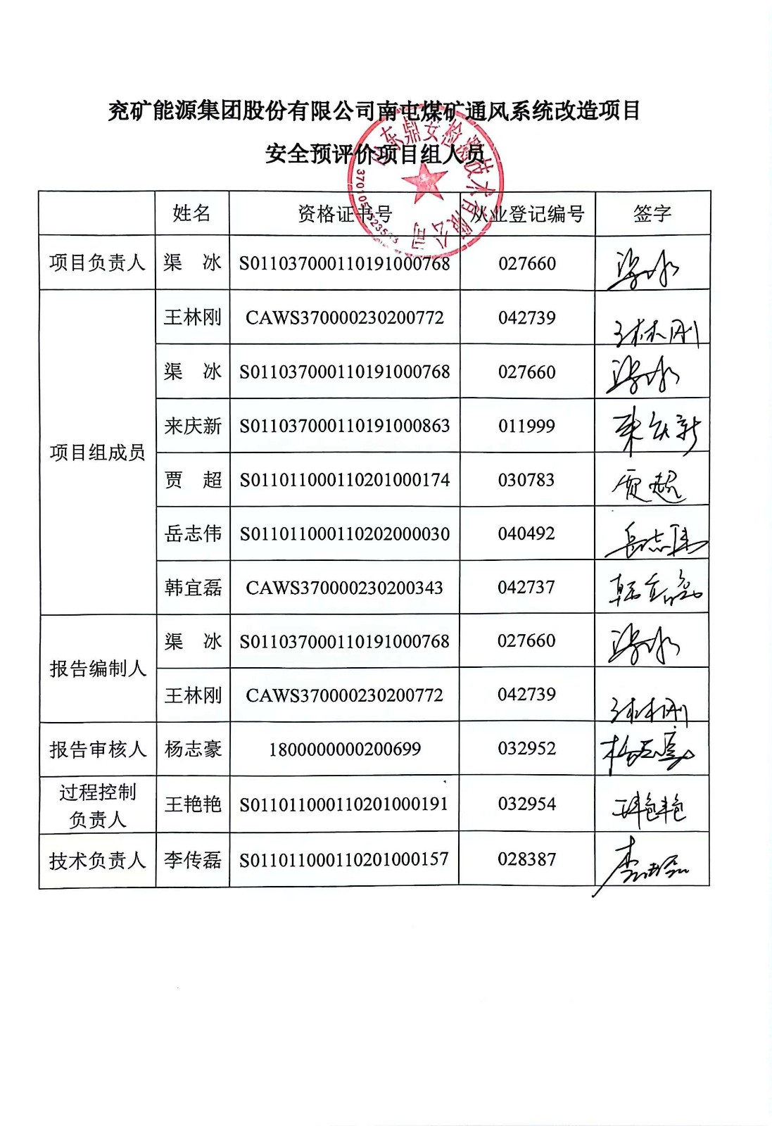 參與安全評價工作的注冊安全工程師:賈超、渠冰、岳志偉、來慶新、李傳磊、王林剛 | ||||||||