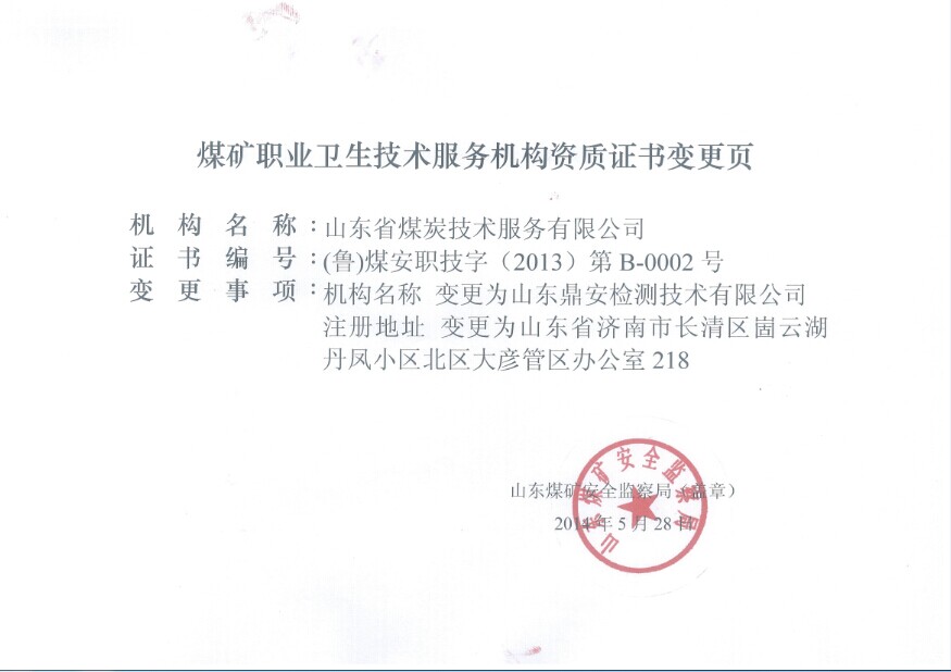 山東省煤炭技術(shù)服務(wù)有限公司(乙級職業(yè)衛(wèi)生技術(shù)服務(wù)機(jī)構(gòu))的資質(zhì)證書機(jī)構(gòu)名稱變更為山東鼎安檢測技術(shù)有限公司。注冊地址變更為山東省濟(jì)南市長清區(qū)崮云湖丹鳳小區(qū)北區(qū)大彥管區(qū)辦公室218。