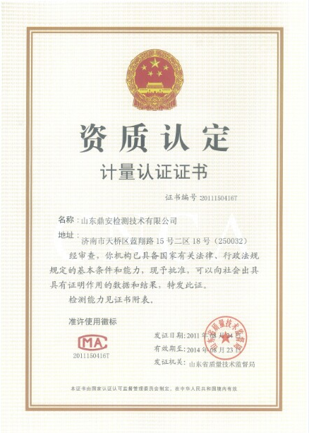 經山東省質量技術監(jiān)督局認證處及專家組對我公司質量體系進行審核,同意山東省煤炭技術服務有限公司的實驗室資質認定計量認證證書機構名稱變更為山東鼎安檢測技術有限公司。
